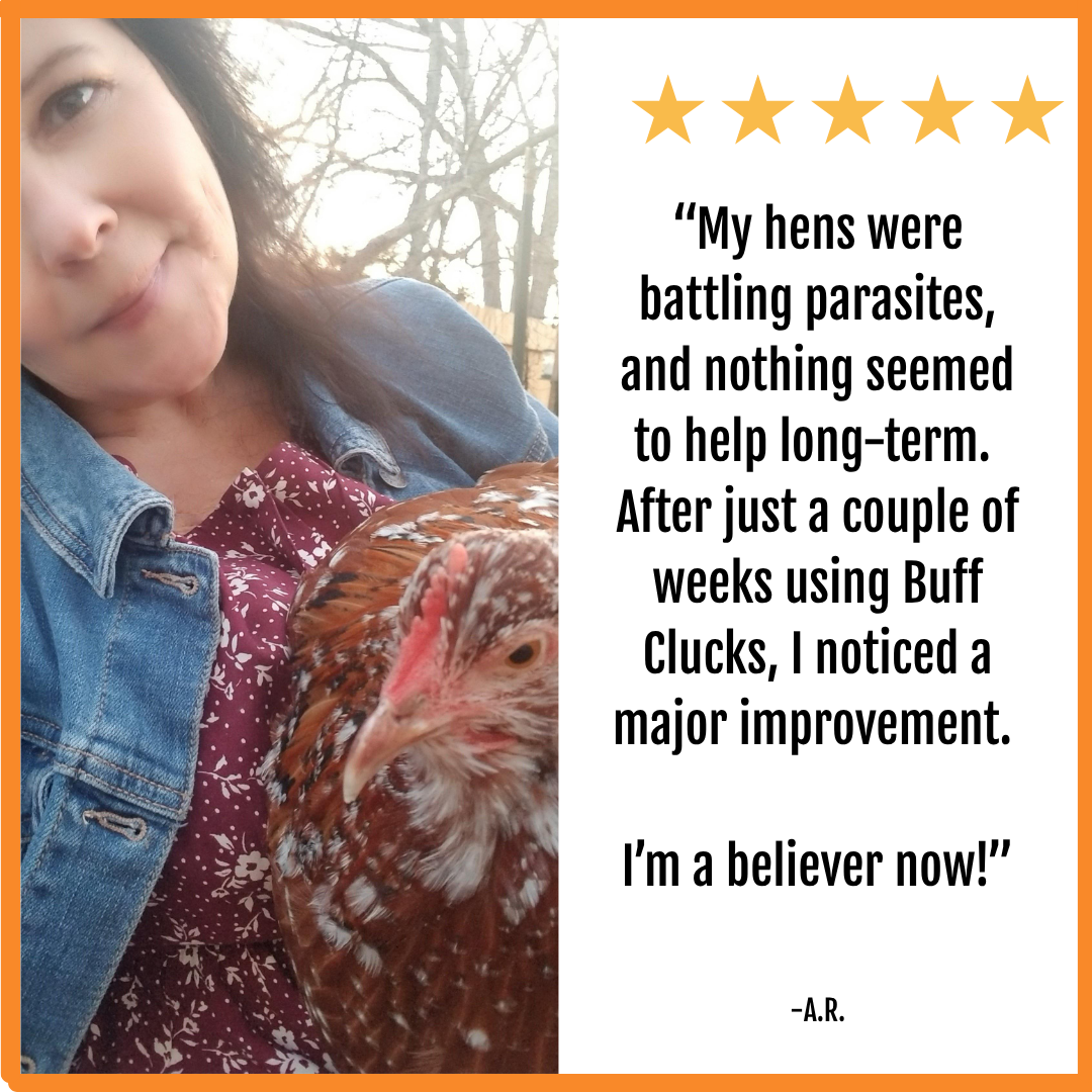 Adding Buff Clucks Herb Supplement® to their feed is the easiest way to protect your chickens from mites, lice, and worms—without harsh chemicals.